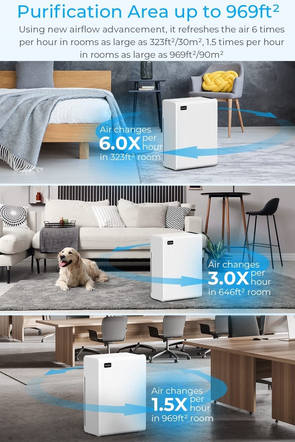 1. Large Room Coverage: With the high-efficiency filtration system, the air purifier covers an area up to 969ft²(90m²).