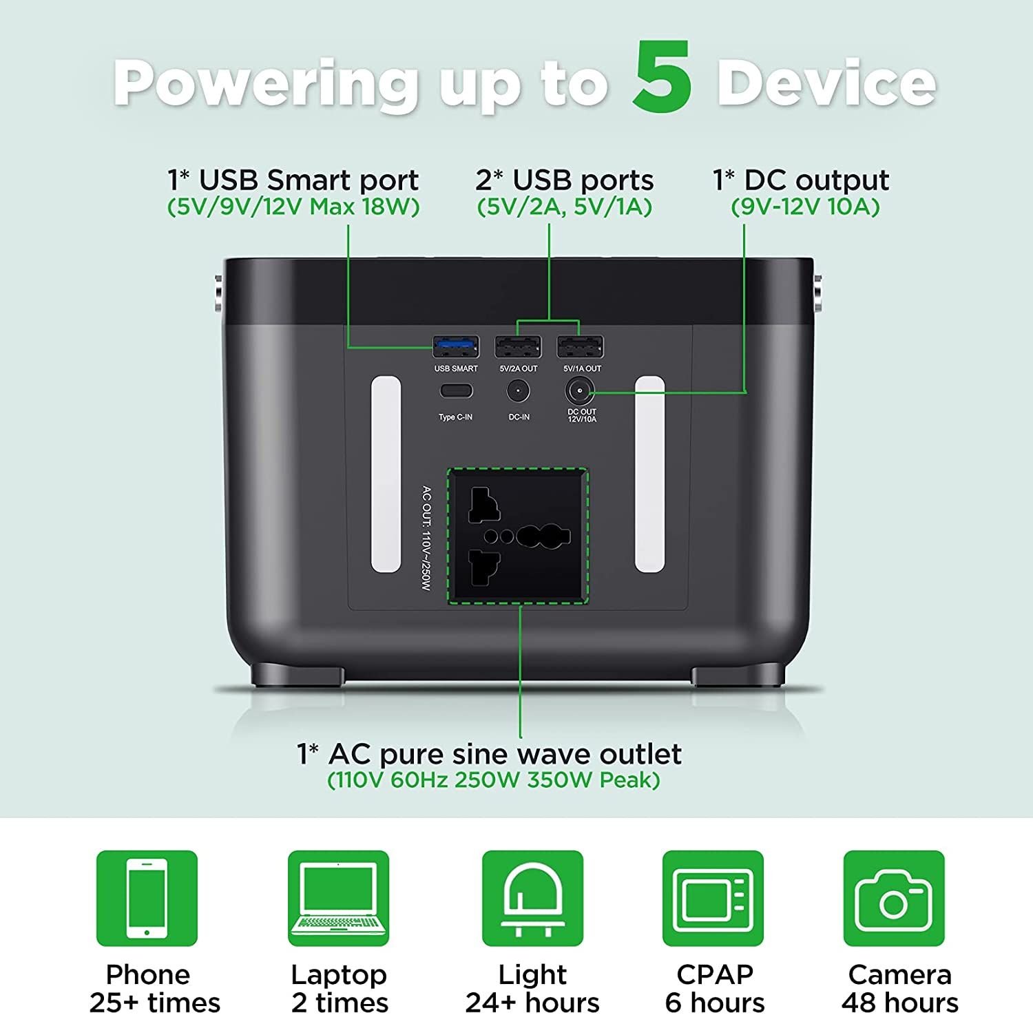 1.POWERING UP TO 5 DEVICES:Featured with AC/DC/USB outputs: 1* AC outlet (110V 60Hz 250W 350W Peak), 1* DC output (9V-12V 10A), 2* USB ports (5V/2A, 5V/1A), 1* USB Smart port (5V/9V/12V Max 18W). can power many equipments such as smartphone, tablet, laptop, camera, light, fans, in-car appliances
