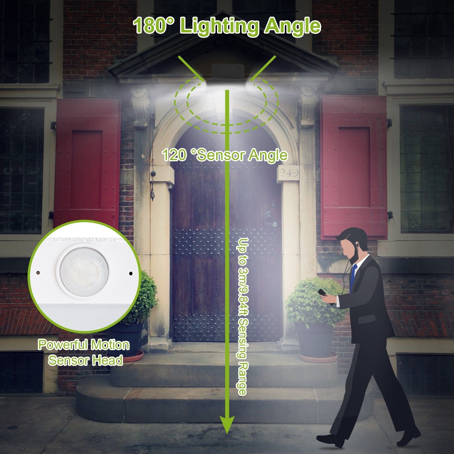 **UPGRADED INBUILT MOTION SENSOR*:Adopts advanced PIR motion sensor offers 120° wide sensing angle can detect motions up to 3m/9.84ft. The sensing range and sensitivity of our solar wall lights are both 20% higher than general LED lights,bringing ultimate using experience.
