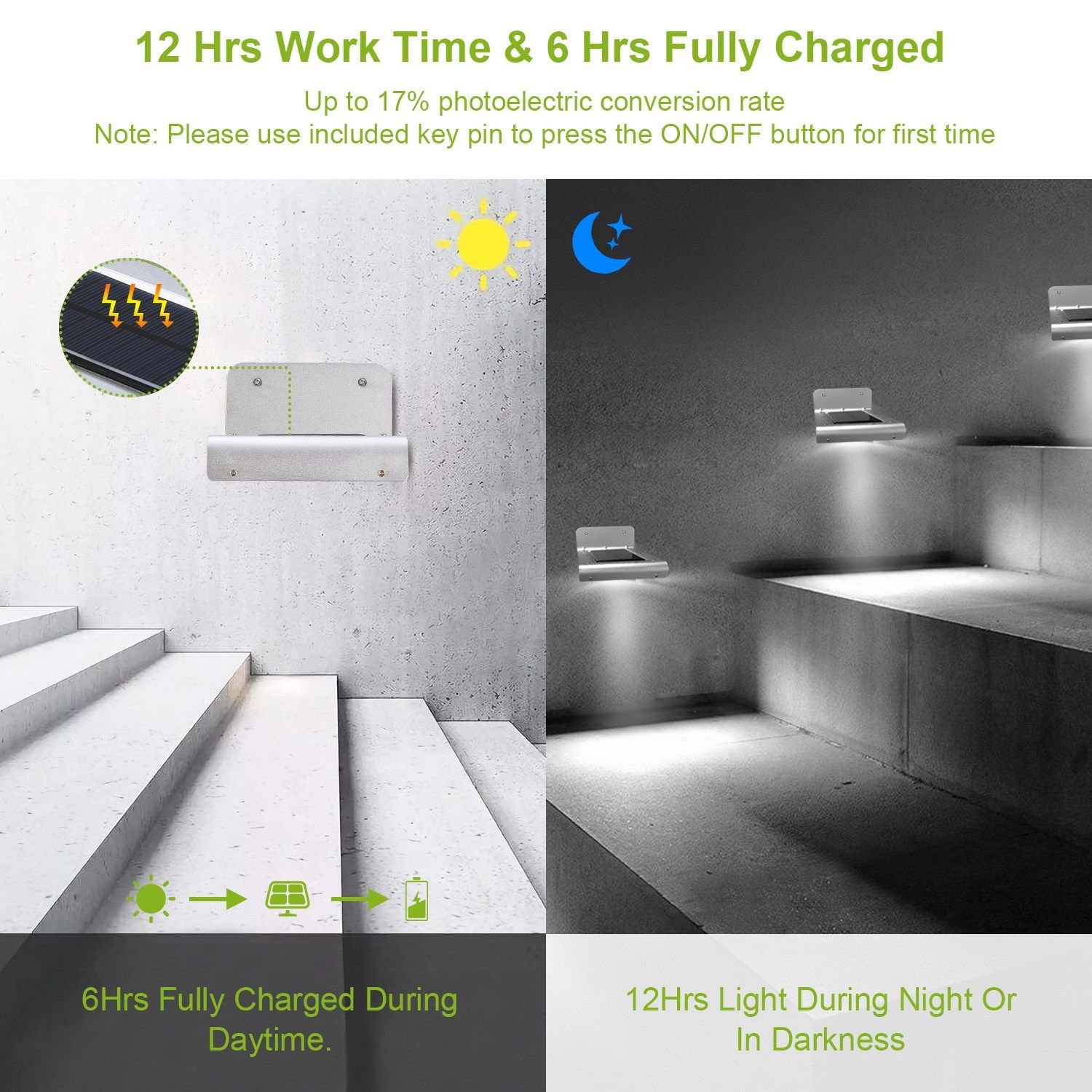**12HRS WORKING TIME*:Its solar panel with 17% high photoelectric conversion can effectively absorb the sunlight on the day and convert sunlight into electricity to fully charge the inbuilt 800mAh battery about 6Hrs. 12Hrs lights your home.