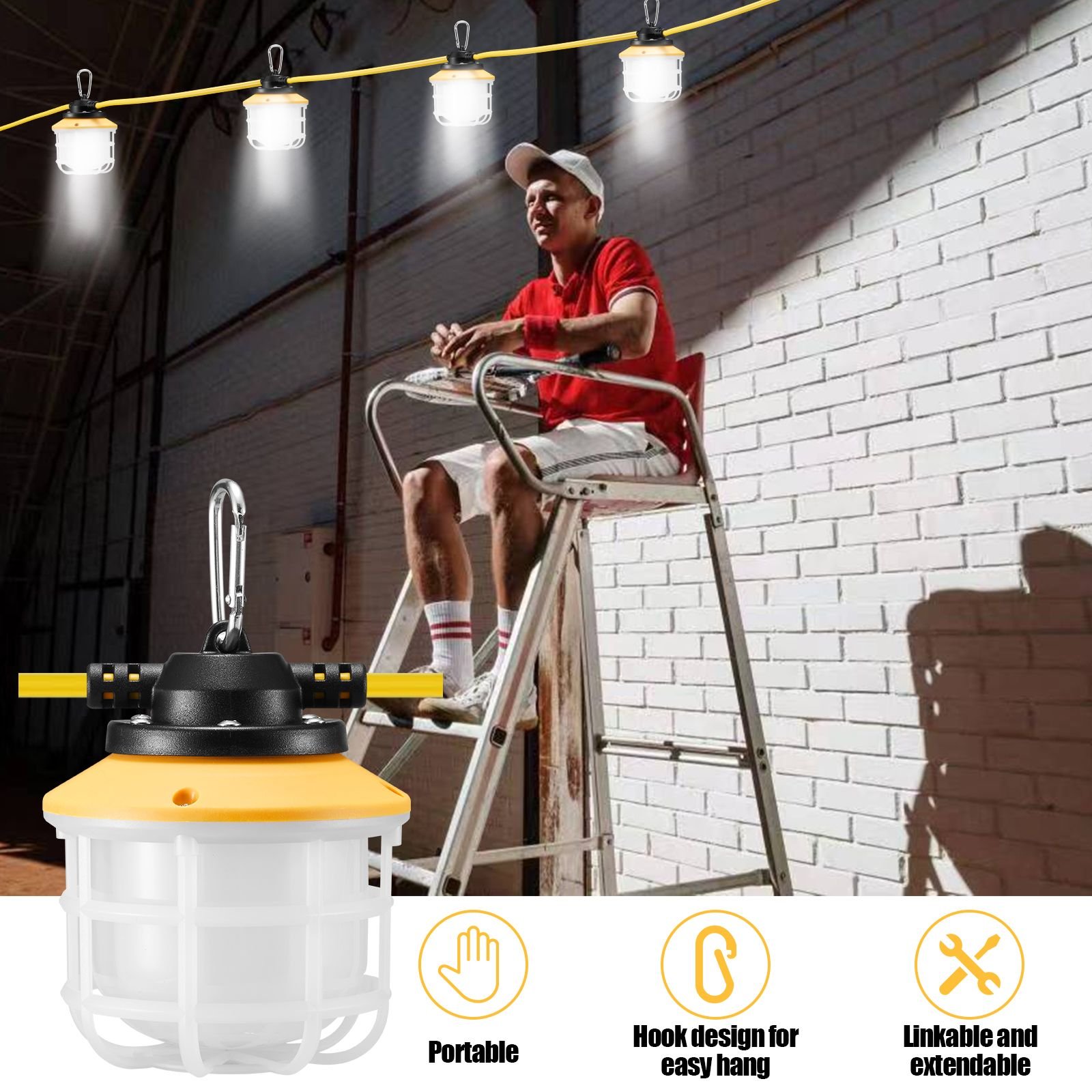 5.The construction string lights are a perfect solution for brightening up any construction site or outdoor workspace. Such as garage, mine cave, docks, warehouses, barn , storage container , attic ,factories, workshops, basements, stairwells and other crawl spaces.